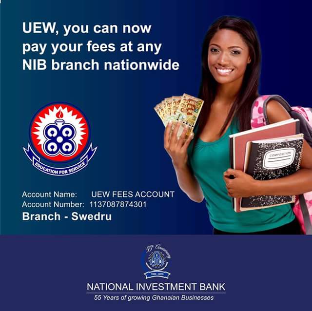 The university of Education in Ghana ( UEW) has announced the payment of students school fees should be paid through any of the branches of National Investment Bank ( NIB) .