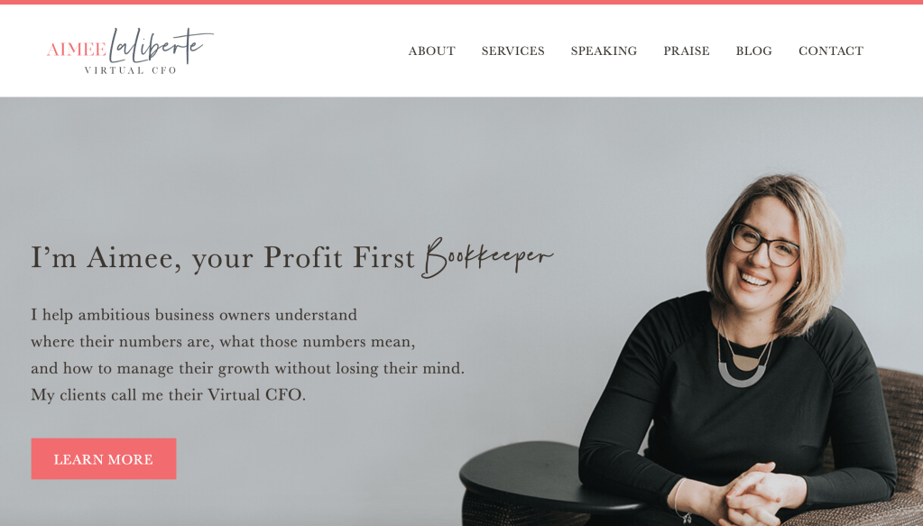 Aimee LaLiberte // Virtual CFOAimee LaLiberte comes from the nonprofit and finance worlds. As a virtual CFO to clients, she has helped more than 75 business owners with bookkeeping and “managing their growth without losing their mind.” She has a solid example of a business website: sections for a blog, testimonials, services, and a well-presented front page with clear calls to action.