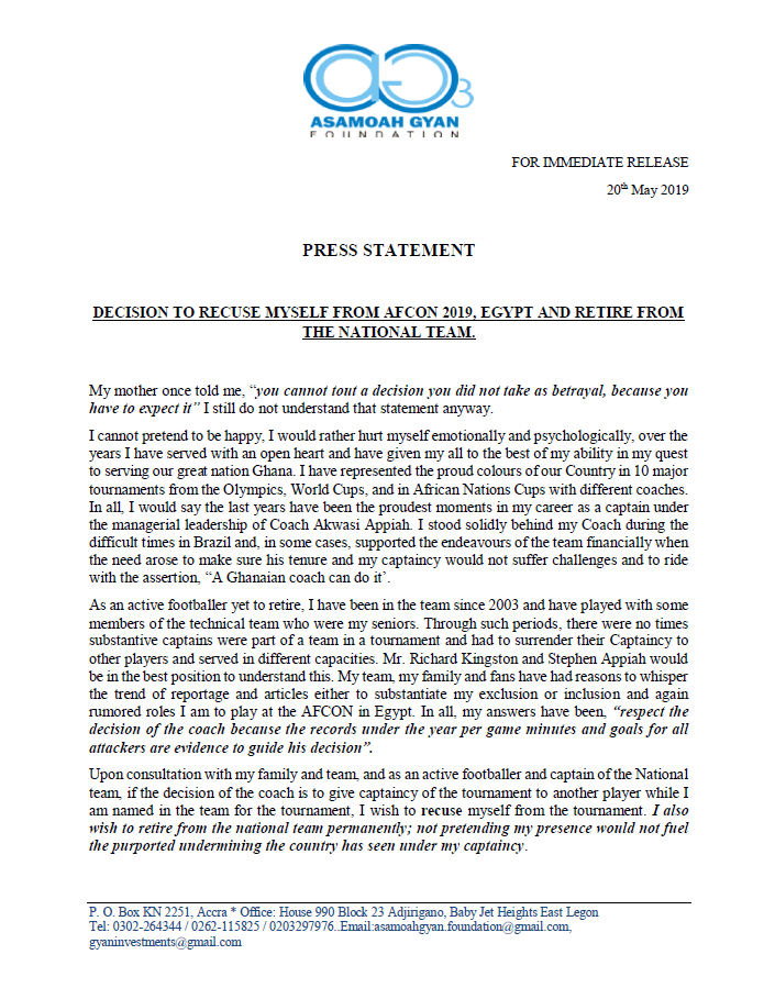 Information reaching atmempiregh.com is that Asamoah Gyan, popularly known as Baby Jet who is the captain of Black Stars has resigned. It is noted that the captain has served the country since 2003 and wishes to resign.