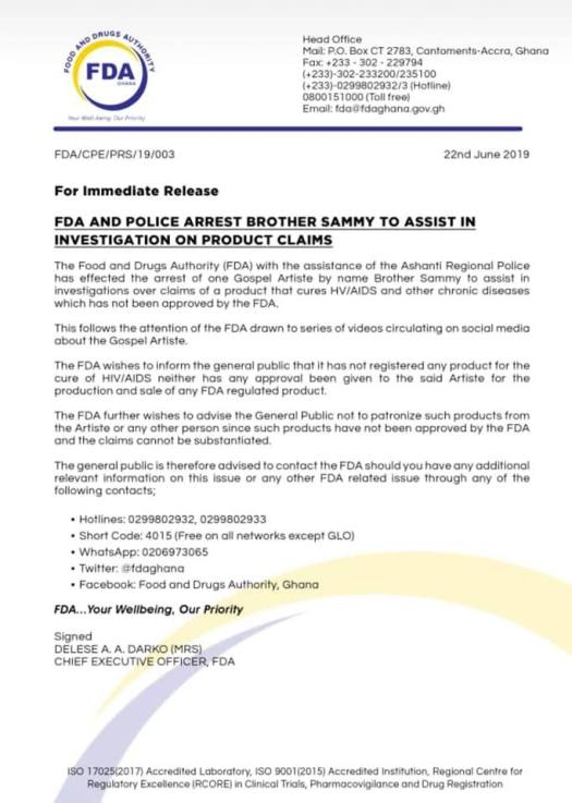 .“The FDA wishes to inform the general public that it has not registered any product for the cure of HIV/AIDS, neither has any approval been given to the said artiste for the production and sale of any FDA regulated product,” FDA said in the statement