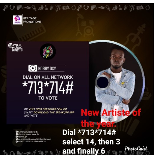 Dial *713*714# . Select 14 for Central music Awards ,then select 3 for new artiste of the year and finally 6 for KOBBY OXY.
