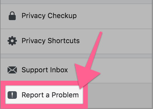 To Report a Problem, click on the Help Center button in the top right corner of Facebook.