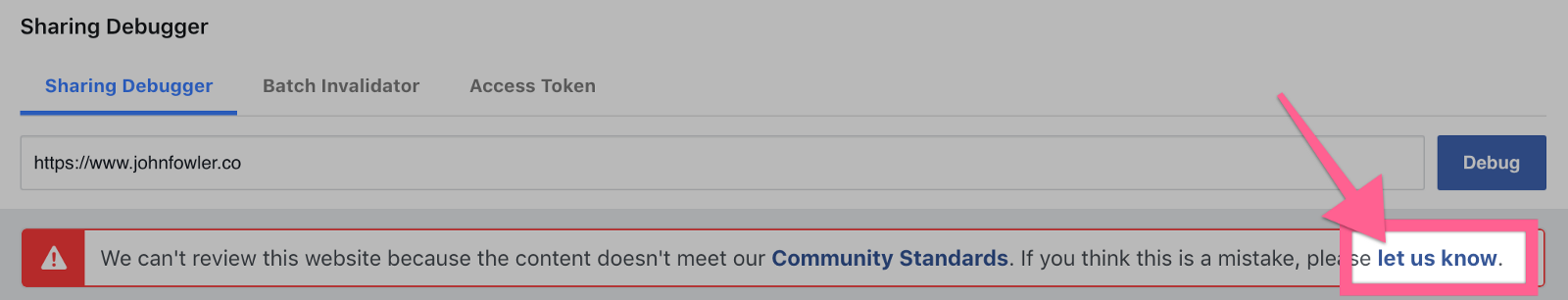 Note that on the Debugger error message above there is a link to inform Facebook that you think this is a mistake.