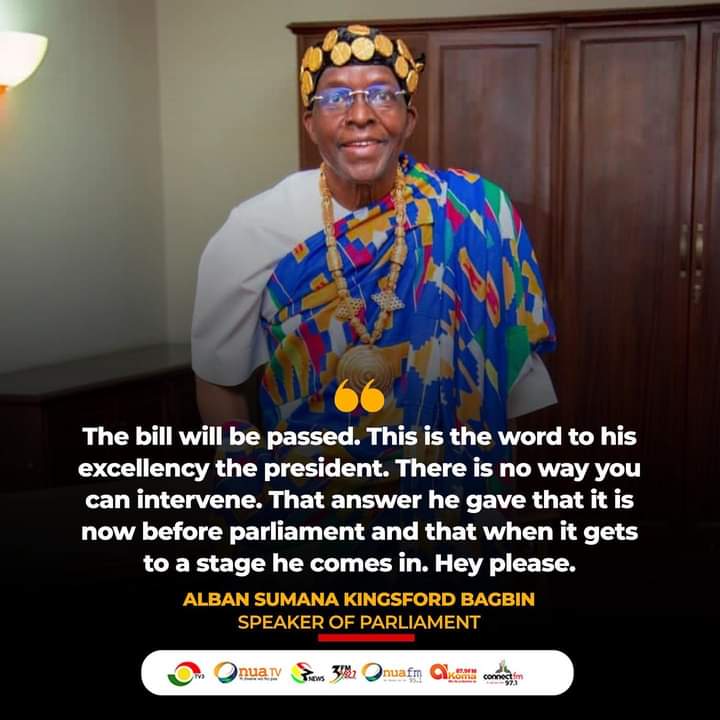 The right Honourable speaker of Parliament ,Alban Sumana Kingsford Bagbin has put His Excellency the president of Ghana Nana Addo to his rightful position on matter about the LGBTQ+bill before Parliament. According to Mr. sparker ” The bill will be passed. This is the word to his Excellency the president. There’s no way you can intervene. That answer he gave that it is now before Parliament and that when it gets to a stage he comes in “.