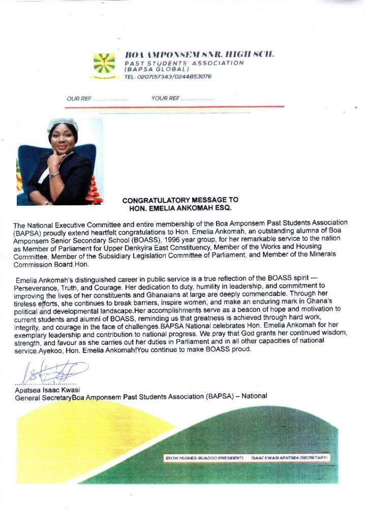 The National Executive Committee and entire membership of the Boa Amponsem Past Students Association (BAPSA Global) have extended their warmest congratulations to Hon. Emelia Ankomah, Esq., a distinguished alumna of Boa Amponsem Senior High School (BOASS), Class of 1996, for her remarkable contributions to national development and public service.